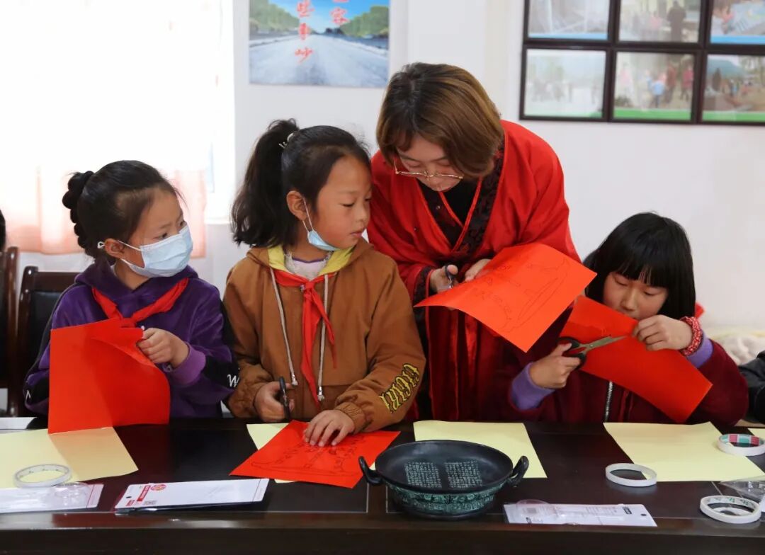 知识课堂结束后,为了加深孩子们对青铜器的印象,提高孩子们的动手能力,宣讲队还为大家准备了非遗手工活动—青铜器剪纸。当拿到印有纹样的剪纸时,孩子们一眼就认出来剪纸图案是刚刚老师讲过的酒器“尊”。